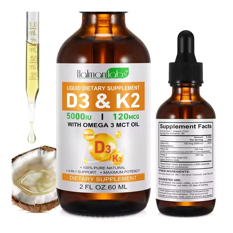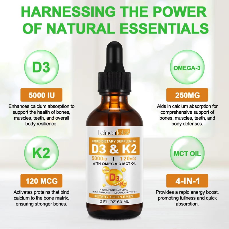 - 2-in-1 Vitamin D3 & K2 Formula: This liquid supplement provides a potent blend of Vitamin D3 (5000 IU) and Vitamin K2 (120 mcg, MK-7), working synergistically to support bone health and calcium absorption.