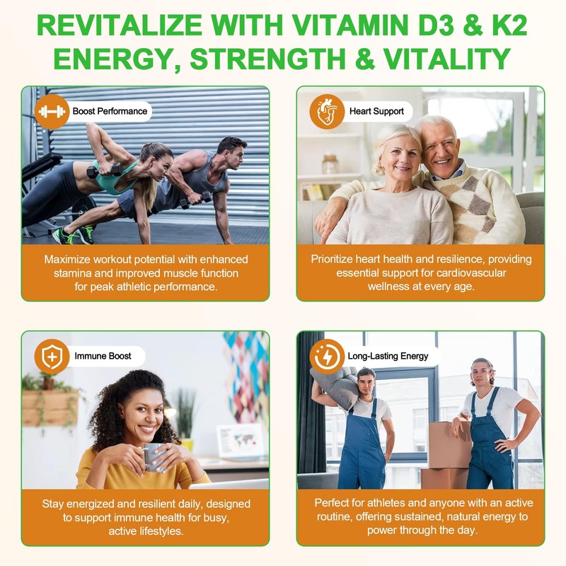 - Bone & Calcium Support: Vitamin D3 helps regulate calcium levels in the body, while Vitamin K2 assists in directing calcium to the bones, contributing to stronger bones and improved skeletal health.