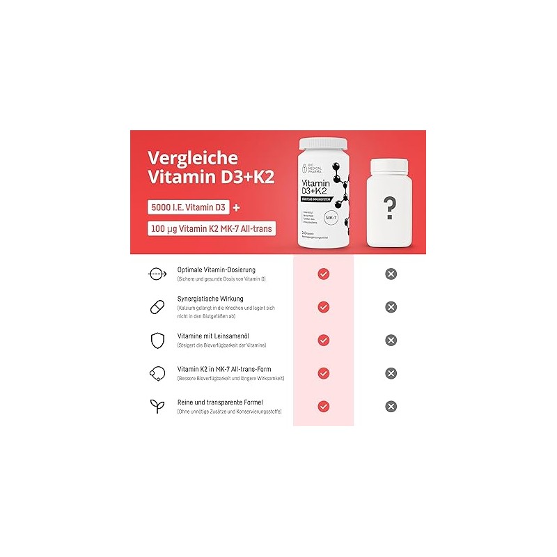 • Our product contains 5000IU vitamin D3 and 100μg vitamin K2 (MK-7)