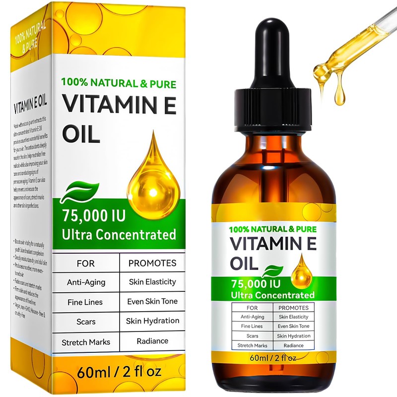 - Vitamin E benefits: Vitamin E oil serves as an anti-aging agent. helping to neutralize free radicals that cause oxidative stress, improving fine lines, wrinkles, and age spots for a more youthful complexion