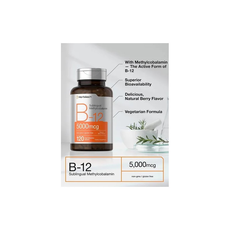 Vitamina B12 5000mcg Horbaach Methylcobalamina, 120 Tabletas Sublinguales – A...
