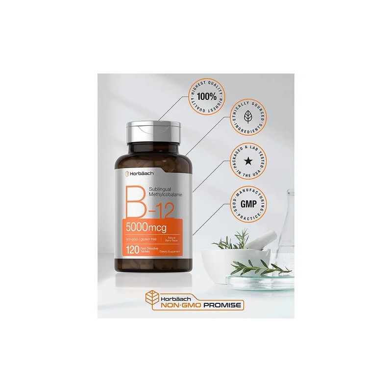 Vitamina B12 5000mcg Horbaach Methylcobalamina, 120 Tabletas Sublinguales – Alta Potencia, Disolución Rápida, Sin Gluten ni OGM, Suplemento Vegetariano