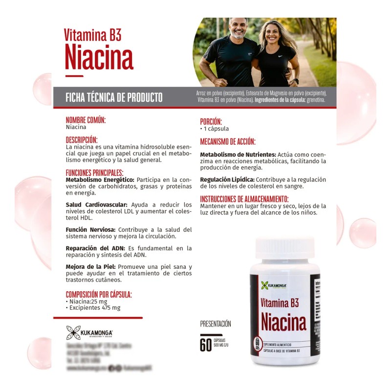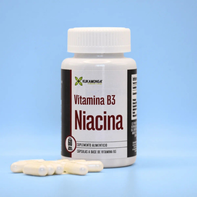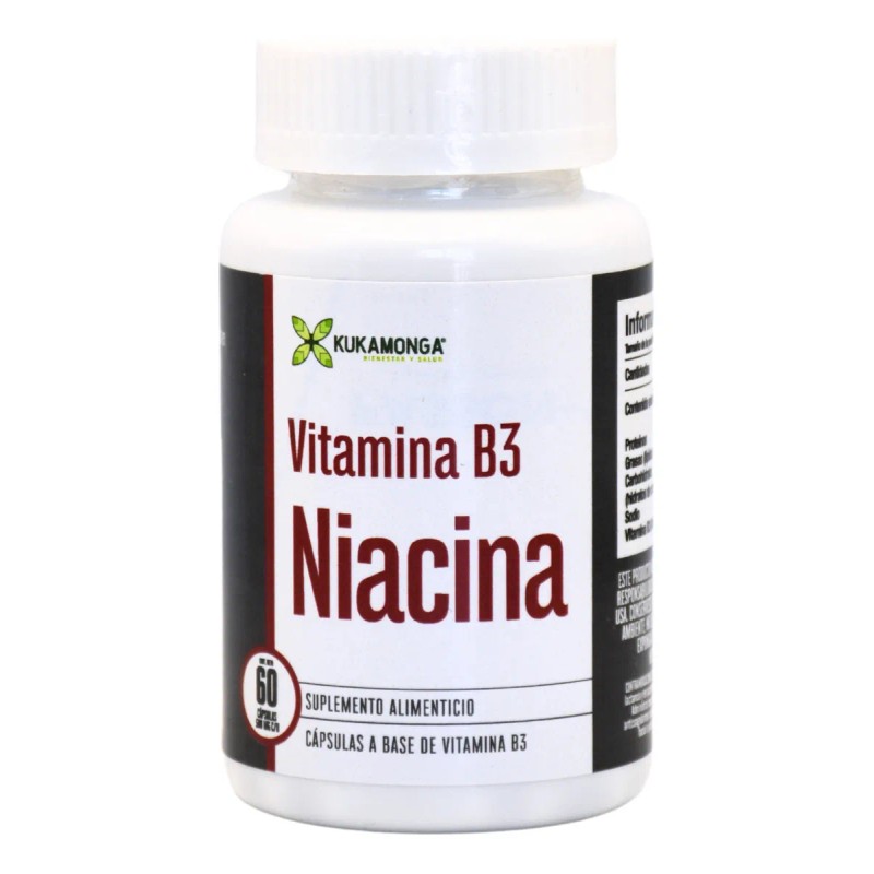 - Vitamina B3 Niacina 500 mg – 60 Cápsulas | Sin sabor | Marca Kukamonga ¡Activa tu energía y apoya tu salud con Kukamonga! Nuestra Vitamina B3 (Niacina) en cápsulas es el suplemento ideal para quienes desean mantener su cuerpo en equilibrio, con energía y funcionando de forma óptima. Su presentación en cápsulas vegetales sin sabor permite una fácil absorción y comodidad al tomarla diariamente. ¿Qué es la niacina? La niacina es una vitamina esencial del complejo B que ayuda al organismo a convertir los alimentos en energía. Además, participa en el funcionamiento adecuado del sistema nervioso, la piel y el metabolismo celular. Beneficios potenciales: Favorece la producción de energía celular. Apoya el sistema nervioso y la función cerebral. Contribuye a mantener la salud de la piel. Ayuda a regular niveles de colesterol en sangre. Promueve una buena circulación sanguínea. Detalles del producto: Contenido: 60 cápsulas Dosis recomendada: 1 cápsula al día Presentación: Frasco con tapa de seguridad Sabor: Sin sabor añadido Duración: Suministro para 2 meses Ingredientes: Vitamina B3 (Niacina) – 500 mg por cápsula Cápsula vegetal (libre de gelatina animal) Advertencias: Si estás bajo tratamiento médico o padeces alguna condición de salud, consulta con un profesional antes de consumirlo. Mantener fuera del alcance de los niños. Calidad Kukamonga: Nuestros suplementos están formulados con ingredientes de alta pureza y calidad, pensando siempre en tu bienestar. Con Kukamonga, estás eligiendo productos confiables, naturales y hechos con cariño. Hecho en México | Libre de gluten | Sin saborizantes ni colorantes | 100% natural Aviso legal