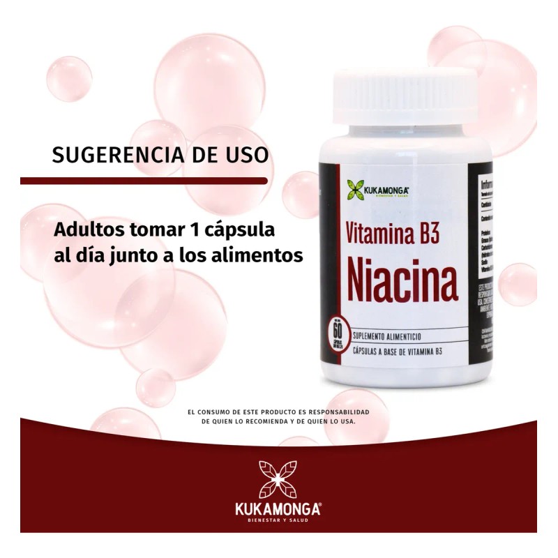 Vitamina B3 Niacina l 60 Cápsulas l Sin Sabor l Apoya la Salud del Sistema Nervioso y Circulación l Contribuye a la Energía y Bienestar General l Kukamonga