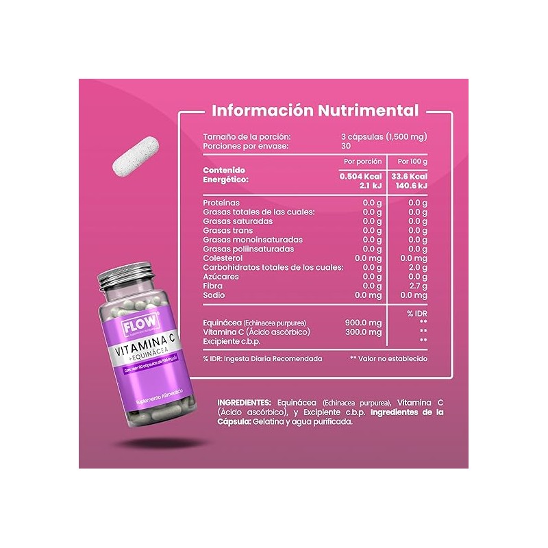 Vitamina C + Equinacea - Sin Sabor- 90 Cápsulas - Sin azúcar Sin Gluten - Flow Supplements