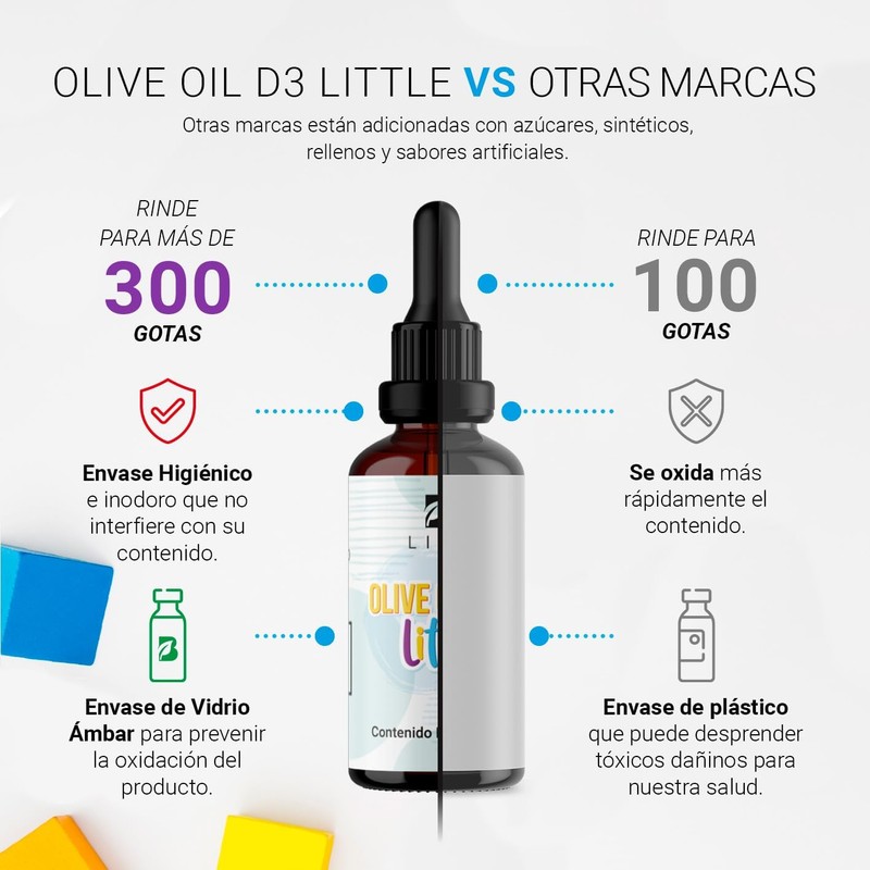 - ¡Protégelos en cada aventura con D3 Little Gotas B Life! Cada porción contiene una composición especial que combina Aceite de Oliva Extra Virgen y Vitamina D3 (400 UI). Una formulación rica de ácidos grasos y vitaminas esenciales para tus pequeños. Esta poderosa combinación no la encontrarás en otras presentaciones. Contiene 10 ml.