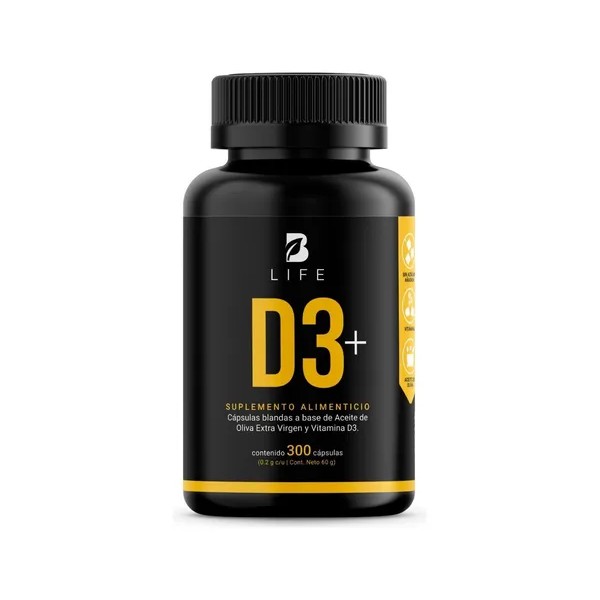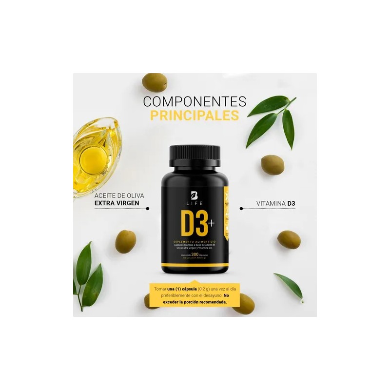 D3+ B Life es tu aliado para la vitalidad. Cada cápsula de 200 mg contiene una mezcla de Vitamina D3 (5000 UI) enriquecida con Aceite de Oliva Extra Virgen, que no solo mejora la absorción sino que también potencia sus beneficios. Una combinación exclusiva de componentes sinérgicos que se distingue de otras presentaciones. El envase incluye 300 cápsulas.