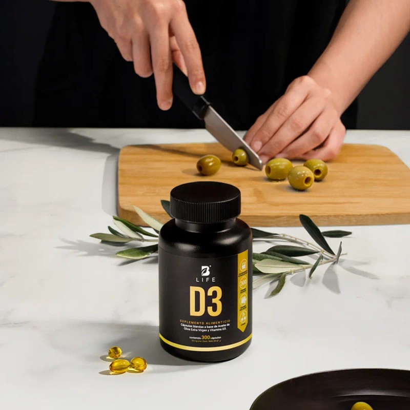 D3+ B Life es tu aliado para la vitalidad. Cada cápsula de 200 mg contiene una mezcla de Vitamina D3 (5000 UI) enriquecida con Aceite de Oliva Extra Virgen, que no solo mejora la absorción sino que también potencia sus beneficios. Una combinación exclusiva de componentes sinérgicos que se distingue de otras presentaciones. El envase incluye 300 cápsulas.