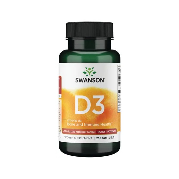 Una ingesta adecuada de vitamina D es esencial para una salud óptima, pero para muchas personas resulta difícil obtener suficiente vitamina D a través de la dieta o la exposición solar. Además, nuestra capacidad para producir vitamina D disminuye con la edad. Según los Institutos Nacionales de la Salud, la mayoría de las personas en Estados Unidos consumen cantidades inferiores a las recomendadas de vitamina D. Obtenga la vitamina del sol en cápsulas blandas con Swanson Vitamin D3, nuestra forma de D3 con mayor actividad biológica. Nuestras cápsulas blandas, fáciles de tragar, aportan 125 mcg (5000 UI) de vitamina D3 liposoluble por porción, en una base de aceite de linaza para una mejor absorción.