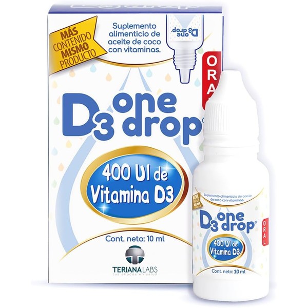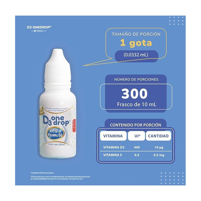 D3 ONEDROP contiene 400 UI de D3 en una base de aceite de coco fraccionado. Esta presentación es de 10 mL con 300 porciones. Administrar vía oral