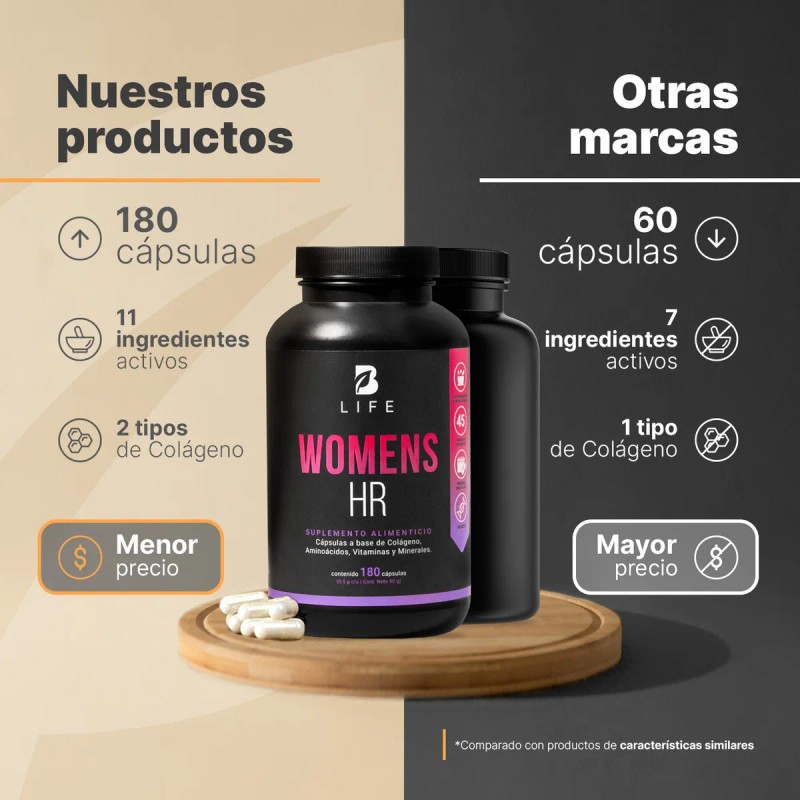 ¡Fuerza y brillo con Womens Hair B Life! Cada cápsula de 500 mg contiene Colágeno Hidrolizado tipo 1 y 3, L-Cisteina, L-Lisina, L-Metionina, Ácido Hialurónico, Zinc, Biotina, Selenio, Vitaminas C y A. Una valiosa sinergia de proteínas y aminoácidos valiosos para tu cabello, ausentes en otras presentaciones. Contiene 180 cápsulas.