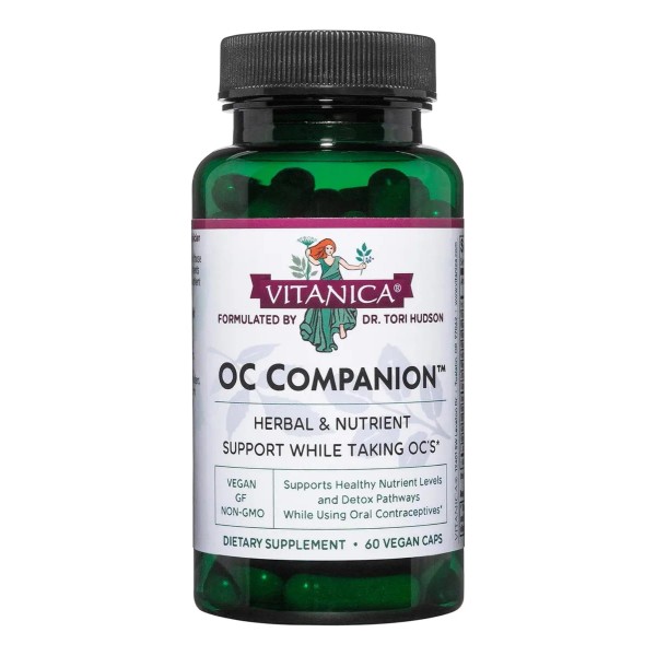 Vitanica OC Companion is a 60-capsule supplement providing nutritional and botanical support for women on oral contraceptives. It helps maintain healthy nutrient levels, promotes balanced hormone metabolism, and supports detoxification pathways with key vitamins (B2, B6, Folate, B12, C, Zinc) and herbs like Dandelion, DIM, Bromelain, and Garlic.