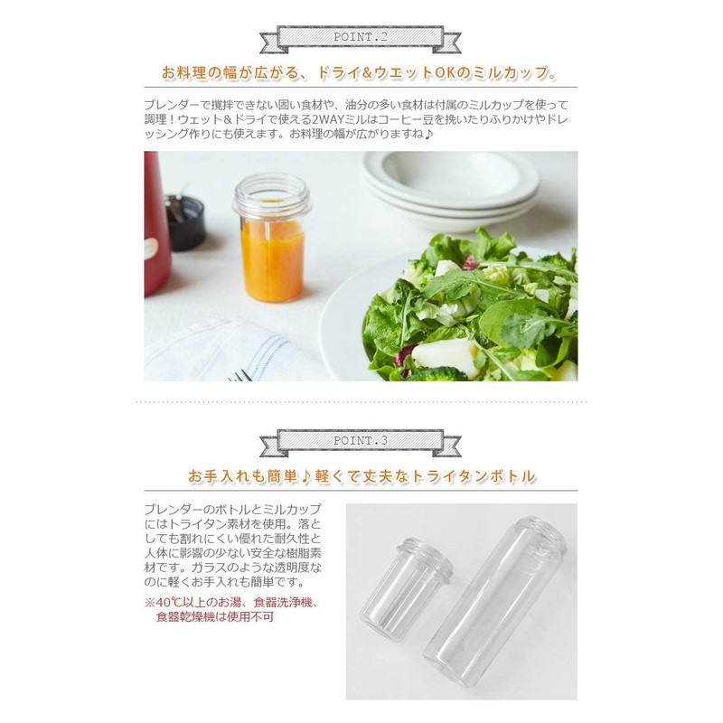 - Material: Body: ABS resin, aluminum; Cap: ABS resin, Bottle, Mill Cup: Tritan, Blade: Stainless steel; Power Supply: AC 100 V, 50/60 Hz; Power Consumption: When using blender: 100 W, when using mil: 120 W