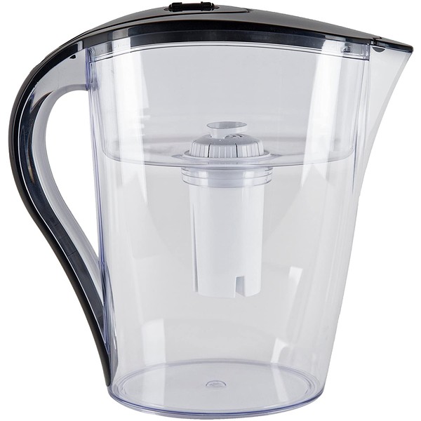 filtration pitcher holds ten cups of water and has a mesh screen and poly-