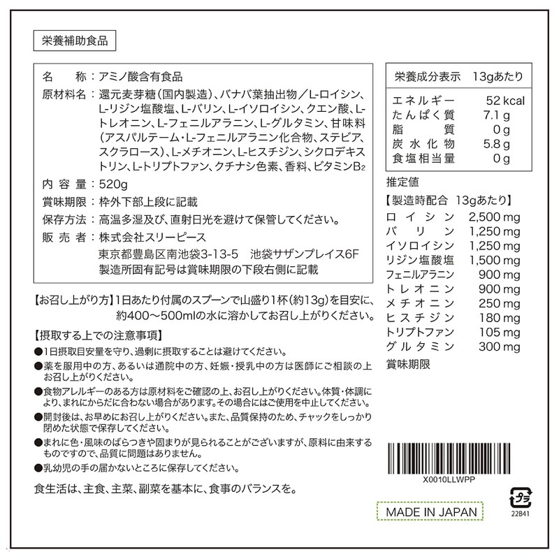 - ロイシン:2,500mg、バリン:1,250mg、イソロイシン:1,250mg リジン:1,200mg、フェニルアラニン:900mg、 トレオニン:900mg、 メチオニン:250mg、ヒスチジン:180mg、トリプトファン:105mg