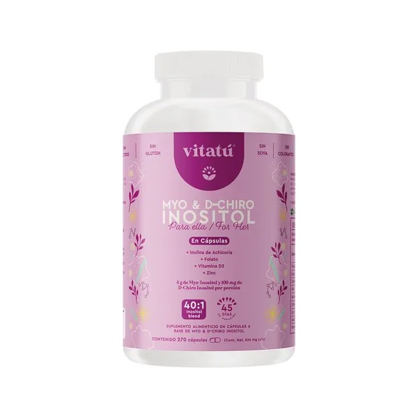 MYO & D CHIRO INOSITOL VITATÚ es un suplemento diseñado para mujeres a base de Myo Inositol, D-Chiro Inositol, Zinc, Folato y Vitamina D3. Relación óptima 40:1 de Myo + D-Chiro Inositol. 4 g Myo Inositol por porción + 100 mg D-Chiro Inositol por porción. Muy fácil y práctico de consumir, 6 capsulas al día, 3 capsulas por la manana & 3 capsulas por la noche despues de los alimentos.