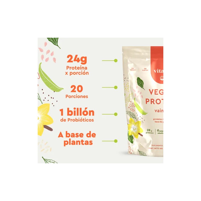 Vitatú Proteina vegana en polvo 24 g de Proteina vegetal por porcion Sin azucar añadida sin gluten sin lacteos y con probioticos 20 porciones 600g sabor vainilla Ingredientes de Origen Natural