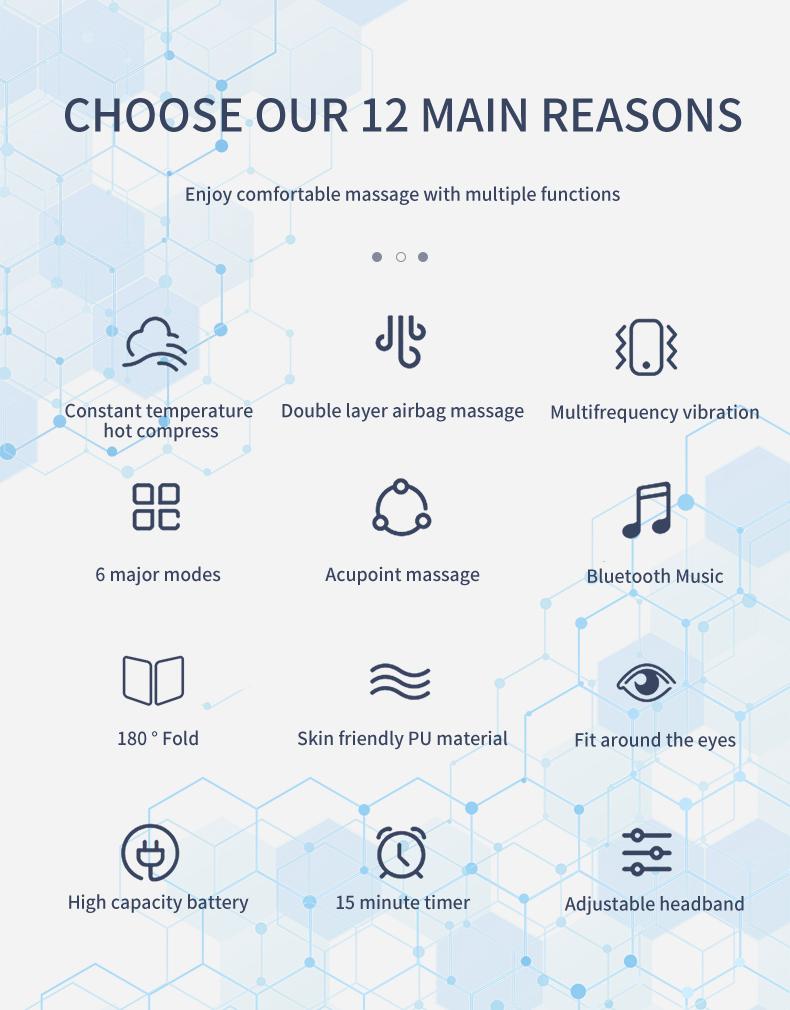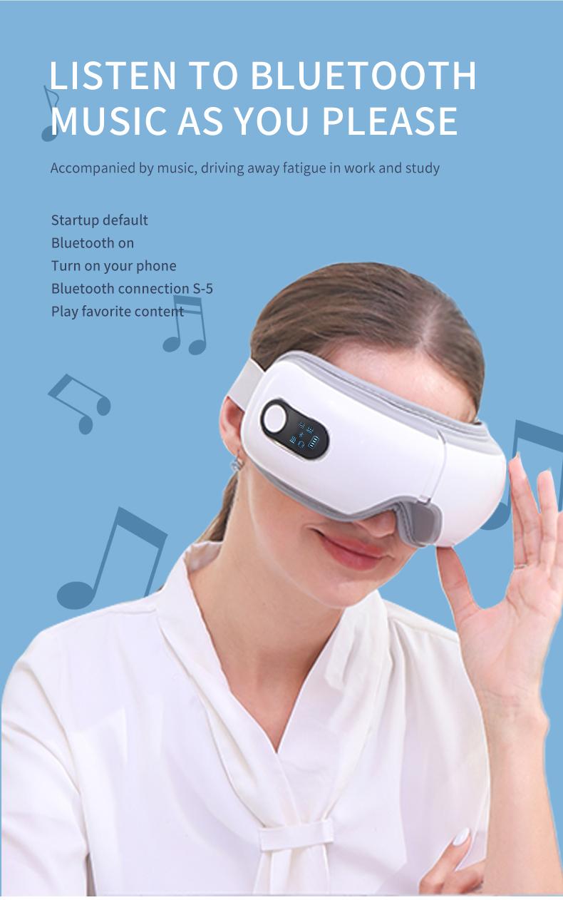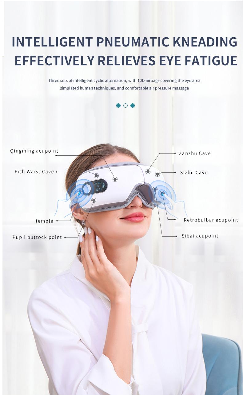 - Relax Your Eyes: Our eye machine adopts oscillating pressure and rhythmic percussion massaging, it can make the skin around the eyes more relaxed, Intelligent timing,Voice Announcements,6 modes, Multi frequency vibration massage,10D airbag massage,Digital LcD display,1800 milliampere carp battery,Constant temperature hot compress,Bluetooth Music.