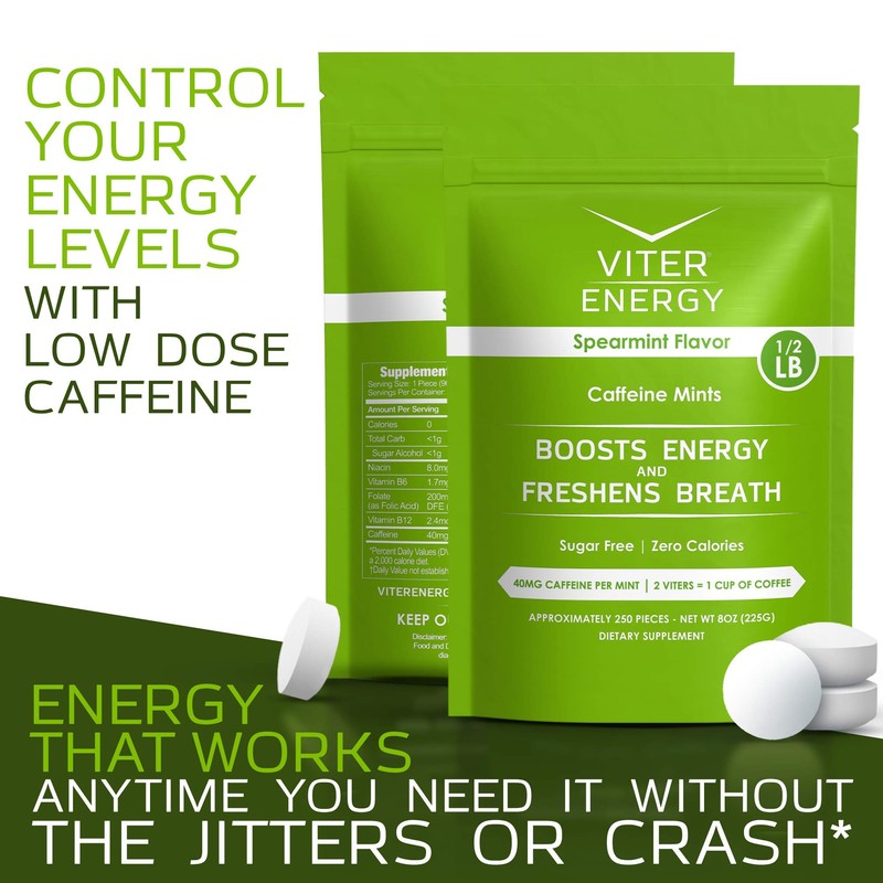 Viter Energy Viter Energy 40mg Caffeine Mints - Sugar Free, B Vitamins, Vegan, Boosts Fast Energized Alert Focus, Caffeinated Nootropic Supplement Pills (Spearmint Flavor, 8oz, Bulk Bag)