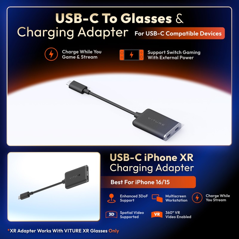 - The USB-C to Glasses Charging Adapter is a must-have accessory that allows you to connect your device to your VITURE One XR Glasses and charge up at the same time. Perfect for staying energized for hours of nonstop, uninterrupted immersion.