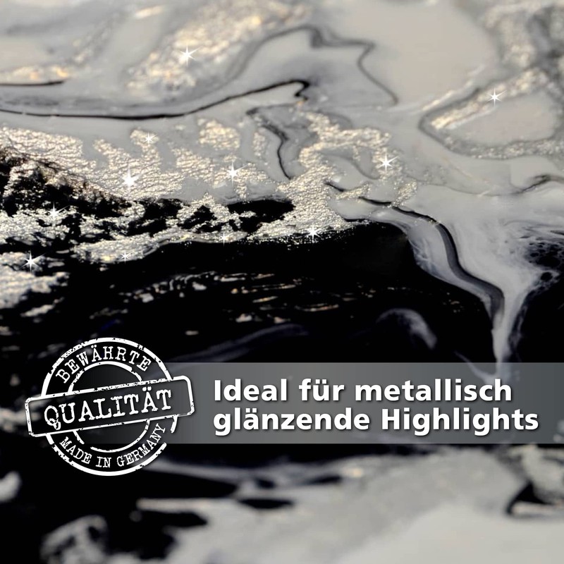 The metallic effect pouring colours have a capacity of 120 ml. They are available in various metallic, shimmering intense and supple colours. It is particularly suitable for pouring technique.