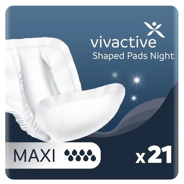 Product descriptionVivactive Shaped Pads Night Maxi provides superior protection against leaks, all night long. This is because our Maxi night pad is significantly more absorbent than other incontinence night pads available. Our night pad features specially designed barrier cuffs that provide you with protection and confidence against leaks all night long. If you're looking for even more protection, why not try teaming our pads with Vivactive Fixation Pants? Save up to 20%. Confidence without the cost. Night Protection Our Vivactive Shaped Pads Night Maxi has been designed with a higher absorbency capacity, providing long-lasting protection against leaks all night long. Superior Protection Our night shaped pad has been designed to be longer in length for lie down protection. They feature reinforced anti-leak barrier cuffs, providing twice the protection against leaks - no matter what position you lie, you will be protected. Two-Piece System For a close-to-body fit, Vivactive large shaped pads have been designed to be worn with Vivactive reusable fixation pants. This provides maximum performance and protection against leaks, ensuring the pad is kept securely in place at all times. TRIPLE LAYER LOCK for Faster Absorption Thanks to our innovative TRIPLE LAYER LOCK, Vivactive Shaped Pads Night Maxi absorb liquid faster while you sleep, to help keep you feeling fresh, dry and confident. Active Odour Control Technology As soon as moisture is absorbed, unwanted odours are quickly neutralised, helping you to stay fresh throughout the night. Wetness Indicator A convenient wetness indicator can be found on the outside of each Vivactive Shaped Pads Night Maxi to help identify when the pad needs to be changed. Kind to Your Skin Dermatologically tested and latex-free. Made from a soft cotton-feel breathable material that promotes airflow to your skin while you are lying or sitting in bed. Made using virgin fluff fibres that do not contain any 'nasties' like chlorine or extra additives. Kind to the Environment Our virgin fluff fibres are sourced from sustainably managed forests and are PEFC Certified.DirectionsApply the protector with the wetness indicator facing upwards. Change the protector when the wetness indicator shows it is full or when you feel it is necessary. Dispose of used protectors in a sealed bag to maintain hygiene. Choose the right size and absorbency level based on your needs.