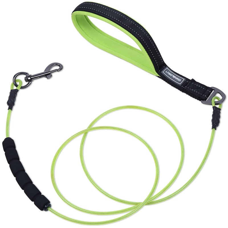 - WATERPROOF & EASY TO CLEAN Wrapped with vinyl coated PVC (not chew proof), the stainless steel rope leash is waterproof and easy to clean, let your dog run freely even in rainy days. Don't worry about it mouldy like other dog leashes. NOTE: The padded nylon handle is not waterproof