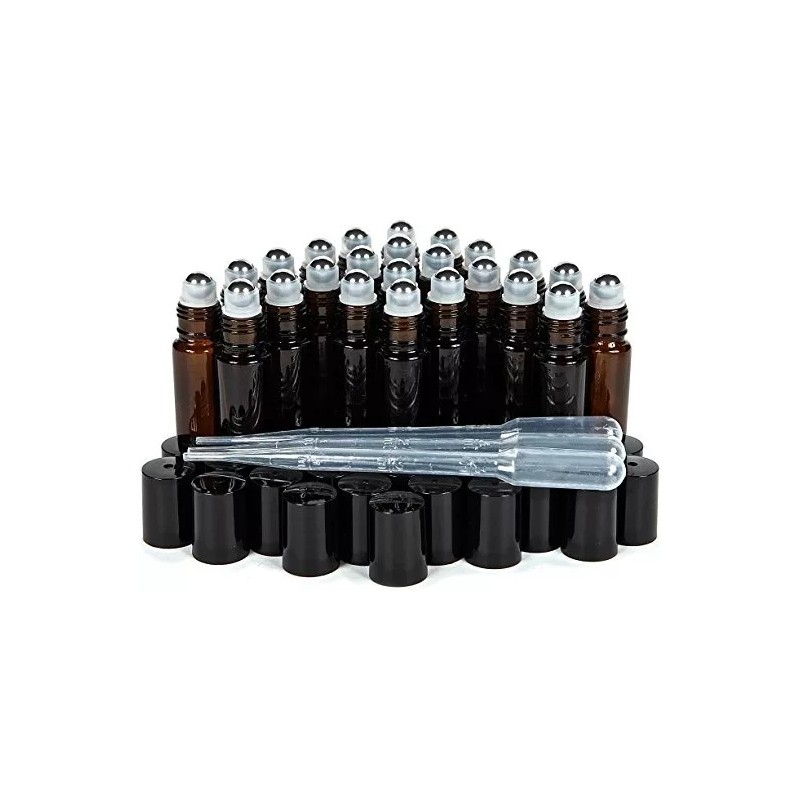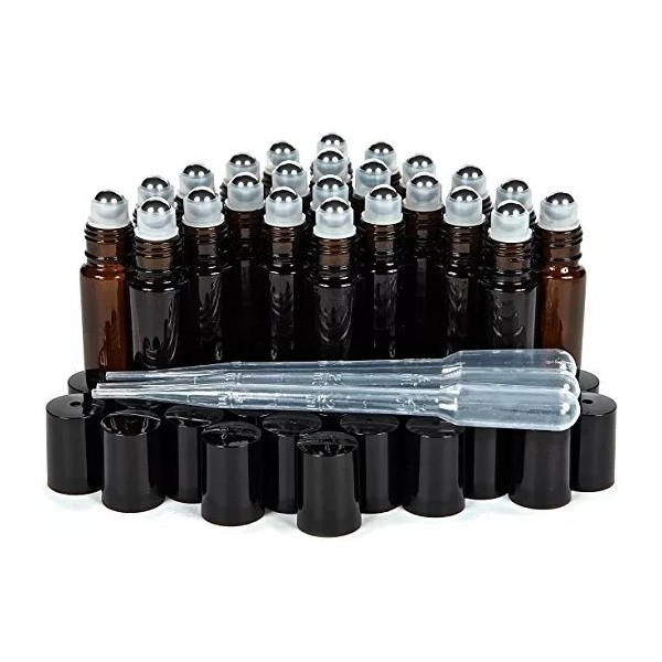 24 de vidrio ámbar Roll en botellas de acero inoxidable con bolas de rodillos y gorras negras. 3 cuentagotas que está incluido; Perfecto para aceites esenciales, aceites de perfume, o de otros líquidos .; embalaje seguro, seguro y conveniente .; Perfecto para viajes, y convenientemente encaja en su bolso .; Vidrio ámbar protege contra los dañinos rayos UV Estos de alta calidad, ámbar, cristal Roll-on botellas con las bolas de rodillos de acero inoxidable son perfectos para su uso con aceites esenciales, aceites de perfume, y otros líquidos. Ajustar en el rodillo-bola colocando suavemente el rodillo-bola en la botella y luego apriete firmemente la tapa hasta que el rodillo-bola encaje. Utilice el roll-on botella para aplicar la cantidad perfecta de producto cada vez. Retire el rodillo-bola mediante la aplicación de presión con la tapa. El vidrio ámbar proporciona protección contra los rayos perjudiciales y con el tamaño adecuado hace que sea perfecto para viajar. Todos nuestros productos son de Estados Unidos SKU 8031820549