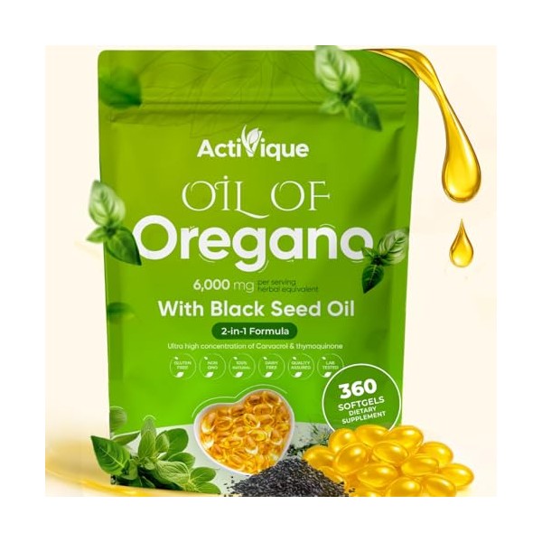 Vivastique Innovations Activique's Oil of Oregano with Black Seed Oil, 4X Strength Carvacrol & Thymoquinone, 2 in 1 Oregano Supplement for Immune Health, Plant Based, Non-GMO, Antioxidant & Immune Support, 360 Softgels