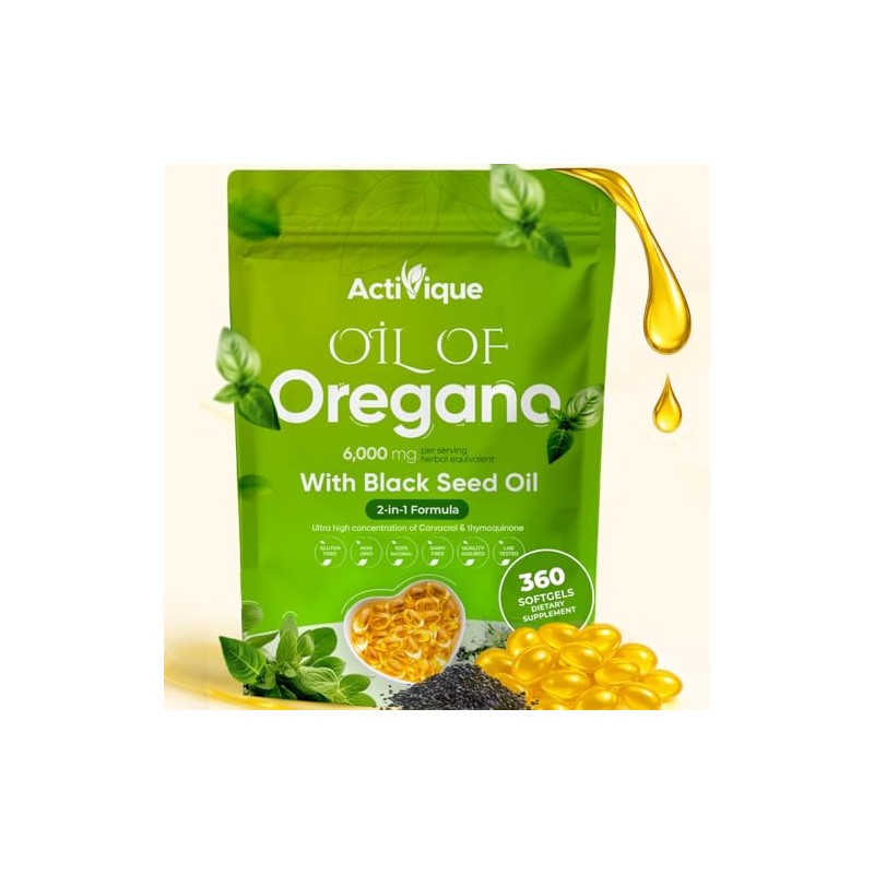 Vivastique Innovations Activique's Oil of Oregano with Black Seed Oil, 4X Strength Carvacrol & Thymoquinone, 2 in 1 Oregano Supplement for Immune Health, Plant Based, Non-GMO, Antioxidant & Immune Support, 360 Softgels