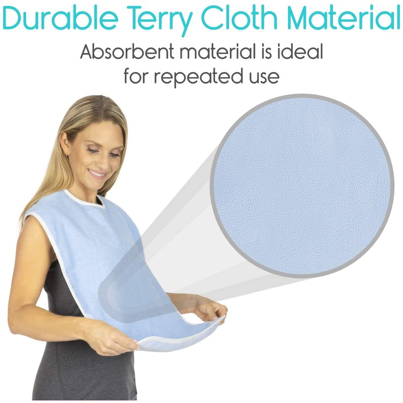 - KEEPS MEALTIMES NEAT: Protecting against spills and splashes, the adult bib keeps clothing neat and tidy during mealtimes or other activities. Each super-absorbent bib is backed by a waterproof lining to prevent stains due to liquids soaking through. Measuring 18” wide and 30” long, the terry cloth bibs provide full coverage with an optional crumb catcher pouch for complete protection.
