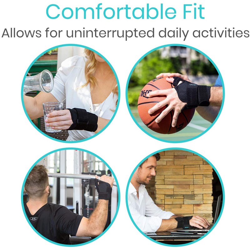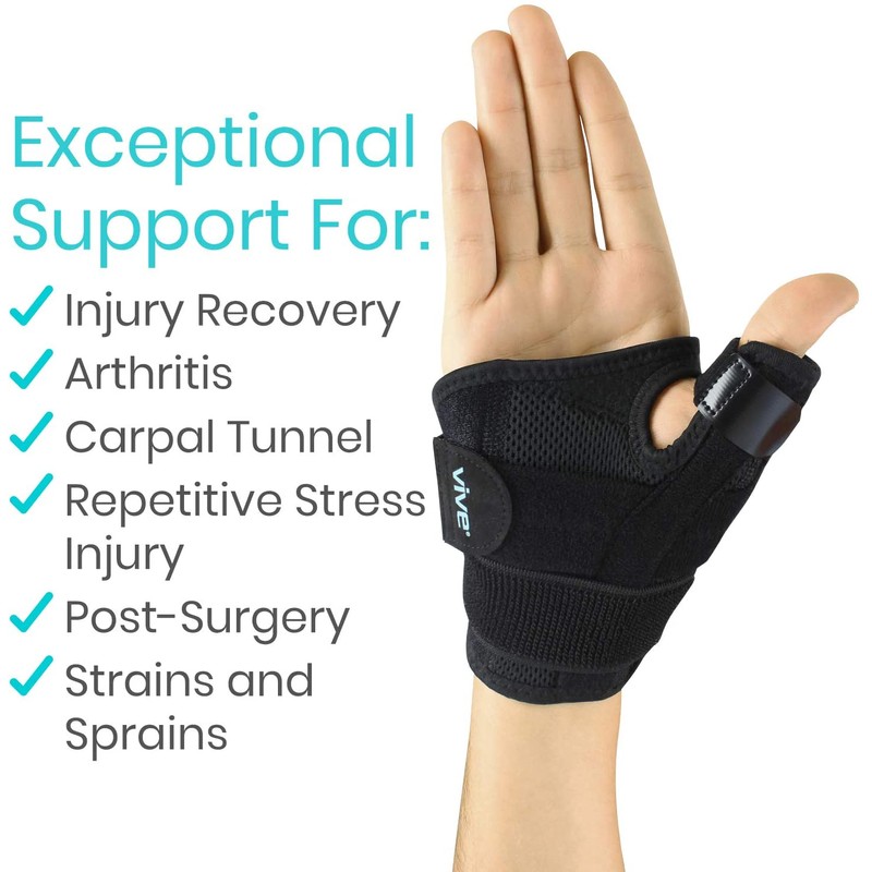 - STABLE SUPPORT FOR THUMB: Supporting the thumb joints and ligaments, the Vive thumb brace restricts the movement of the thumb while supplying adjustable compression and retaining therapeutic heat to improve circulation and promote healing. The lightweight brace allows the full use of the remaining fingers so you can complete daily tasks with ease.