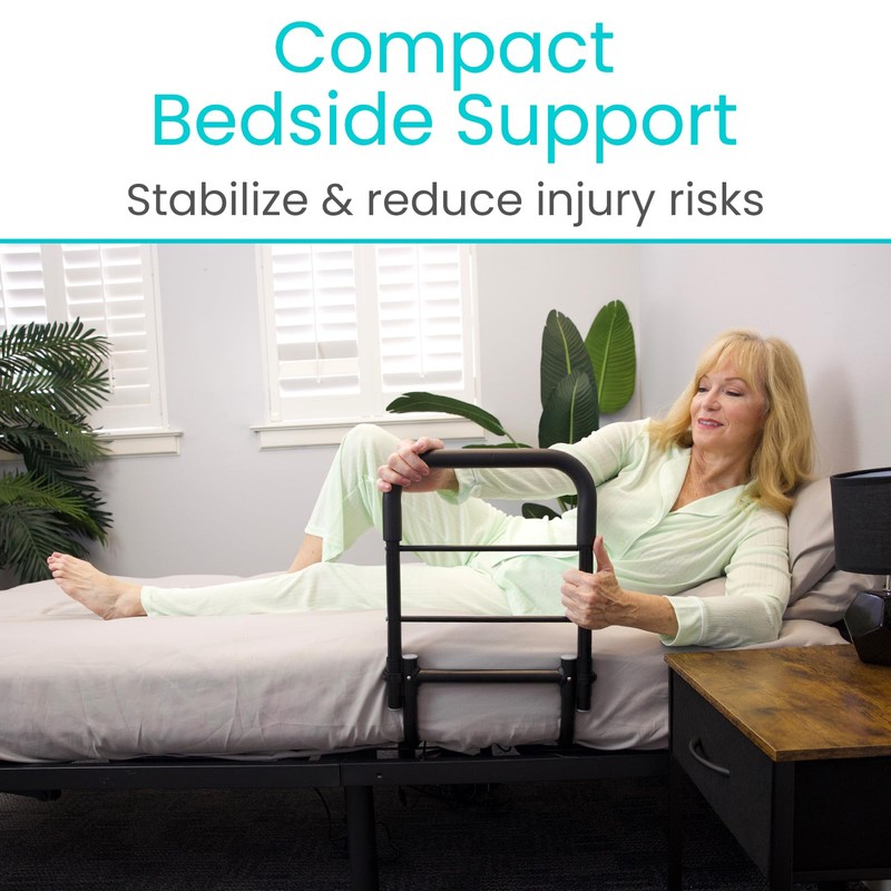 - ENHANCED SAFETY AND BEDSIDE SUPPORT: Enhance your bedside safety and ease of movement with the Vive Height Adjustable Bed Rail. Designed for seniors, post-surgery recovery, or those managing back pain and injuries, this bed rail offers adjustable height settings to facilitate smoother transitions between sitting and standing, reducing the risk of accidents and reinjury. With a 21” stabilizing bar and a secure anchor strap, this bed rail is designed to provide dependable support.