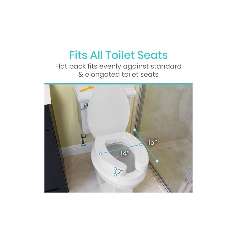 - Ajuste universal para asientos de inodoro estándar y alargados: mide 13 pulgadas de ancho y 16 pulgadas de adelante a atrás, el cojín de asiento de inodoro Vive está diseñado para adaptarse a la mayoría de los asientos de inodoro estándar o alargados. Su respaldo plano permite una integración perfecta con la tapa del asiento del inodoro.