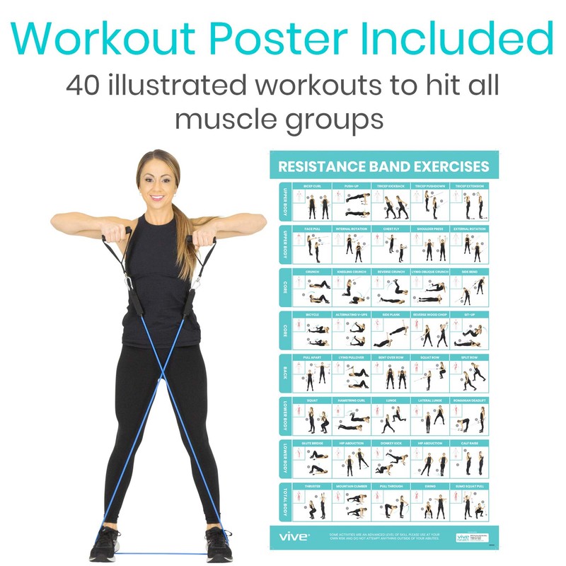 - 11 PIECE SET INTEGRATES WITH ANY WORKOUT: The durable tube resistance bands set includes two secure grip handles, two ankle straps and a repositionable door anchor that can be used for general exercise, stretching and strength training or as part of a workout program. Increases the effectiveness of programs such as P90x, Insanity, Crossfit, Beach Body, Yoga, Pilates and rehabilitative workouts. Bonus resistance band exercises poster included.