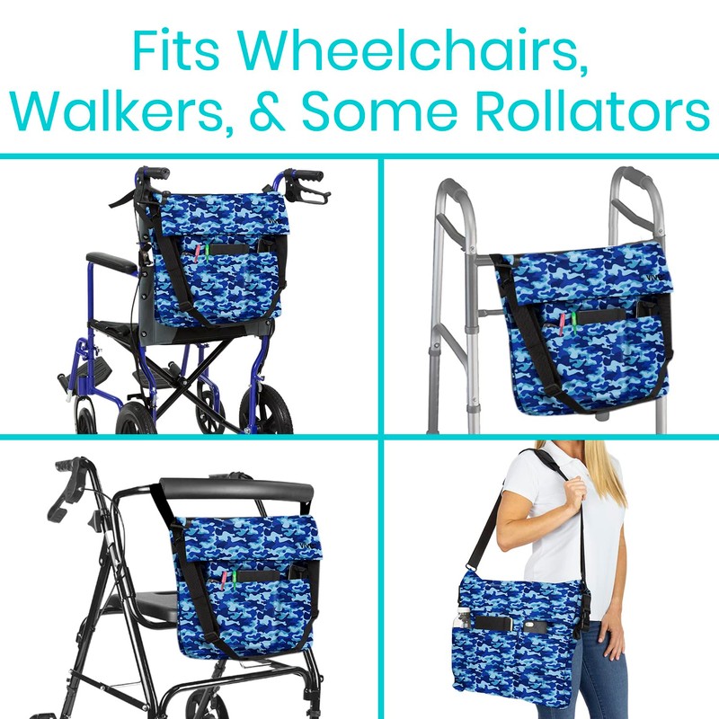 - FITS ALL WHEELCHAIRS, WALKERS, & ROLLATORS: Durable wheelchair bag attaches with two easily adjustable straps, allowing it to fit on all standard wheelchairs and transport chairs. It can also be used on standard walkers.
