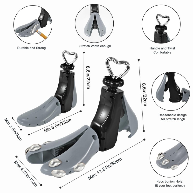 - 【4-way Adjustable Shoe Stretcher】Shoe stretcher is suitable for wide-footed men and women, 4-way stretch can stretch the length to make the shoe bigger, stretch the width to make the shoe wider; bunion pads help to expand the precise area, height pads can fit all kinds of shoes that need height; using shoe stretcher, your shoes will become spacious and comfortable; shoe stretcher kit can solve many painful problems, such as too tight, wide feet, bunions, etc