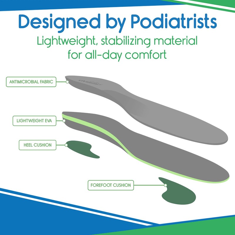 • Plantillas de arco reforzadas diseñadas por podólogos: diseñadas por podólogos para proporcionar un soporte superior del pie, el arco y el talón están reforzados con un material compuesto firme para un apoyo superior. Las plantillas ortopédicas también incluyen acolchado de espuma adicional en el antepié y el talón para absorber el impacto de cada paso para aliviar los puntos de presión.