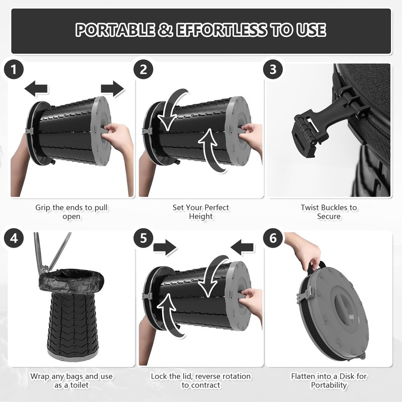 - Multi-functional integration: a multi-purpose, greatly saving travel equipment space and weight. Open the lid as an emergency toilet or trash can; close the lid as a folding stool or firm side table; or as a storage bin. Ideal for camping, hiking, RV travel, fishing, sailing, long-distance driving and family emergencies.
