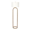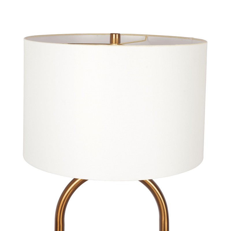 - Sleek brass ring base and spacious white drum shade create a modern and stylish statement piece.