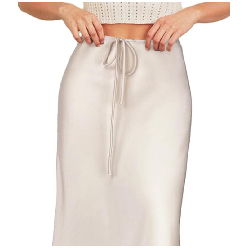 VividHarbor Women's Drawstring Satin Maxi Skirt High Waist Silk A Line Flowy Long Skirts Beige