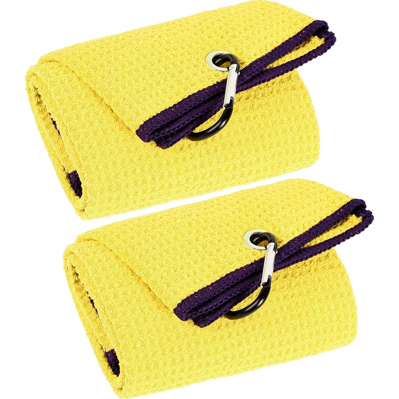 VIVIDLY 2 Pack Tri-fold Golf Towels, Premium Microfiber Fabric Waffle Pattern with Black Heavy Duty Carabiner Clip, Yellow Golf Towels for Golf Bags for Men (Yellow)