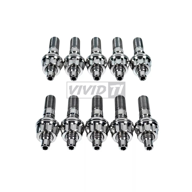 VividTi's Titanium Stud Kits are CNC machined & made of high quality Grade 5 Titanium with a built in hex key tip that allows them to be installed ONLY by hand using a 3mm Allen wrench. Titanium 12-point nuts (12mm) and washers are included!