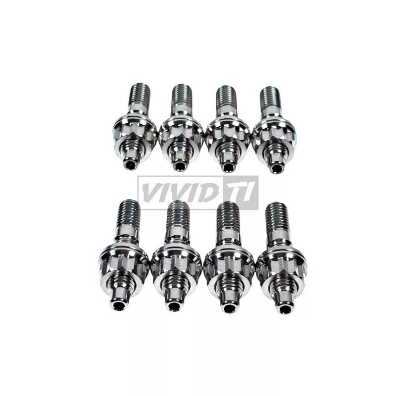 VividTi's Titanium Stud Kits are CNC machined & made of high quality Grade 5 Titanium with a built in hex key tip that allows them to be installed ONLY by hand using a 3mm Allen wrench. Titanium 12-point nuts (12mm) and washers are included!