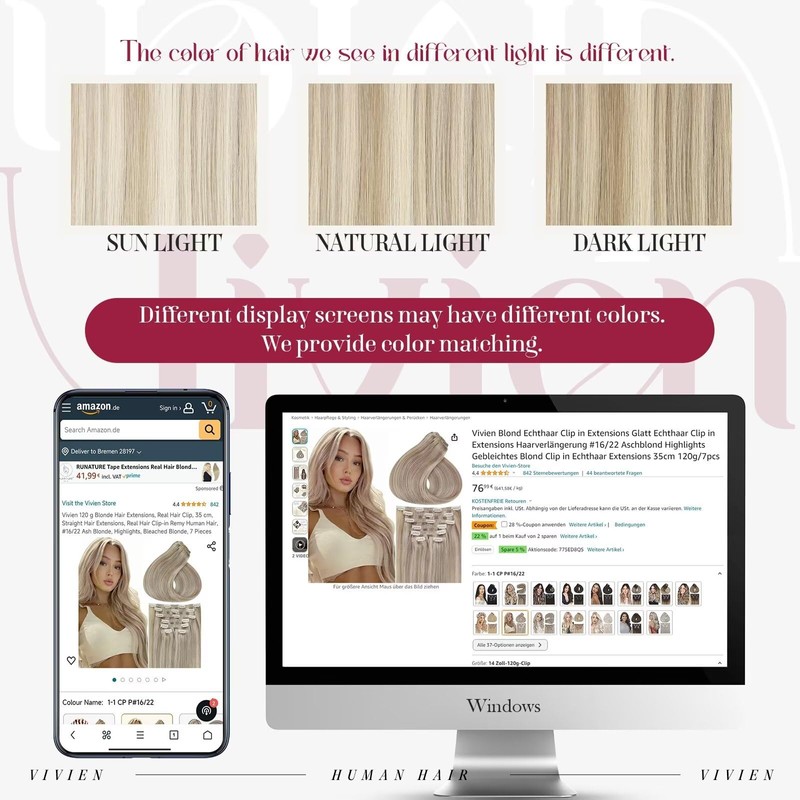 - Natural and shiny: There are different balayage, ombre, highlight clip-in human hair extensions, so you can choose several options to make different hairstyles. There may be a slight colour difference due to different monitors.