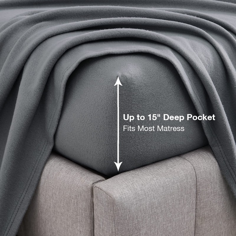 - 4 PCS Fleece Sheet: dark gray king size polar fleece sheet set include: 4-piece king size fleece flannel bed sheet set includes 1 king fleece fitted Sheet: 78"×80" + 15", 1 king fleece flat sheet: 102"×108" and 2 king pillowcases: 20"×40" with 4" hem. The winter fleece sheet set includes a 15 inches deep pocket fitted sheet with elastic all around, which not only fit perfectly but they do not lift up on the sides, restful sleep guaranteed