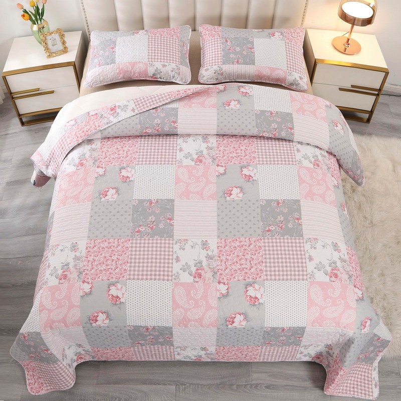 VIVILINEN Pink Plaid Patchwork Quilt Set Full Queen Size Floral Rversible Quilted Bedspread Coverlet Set 3-Piece Grey Grid Flowers Lightweight Comforter Bedding Set Bed Sheet Cover Blanket with 2 Pillow Shams