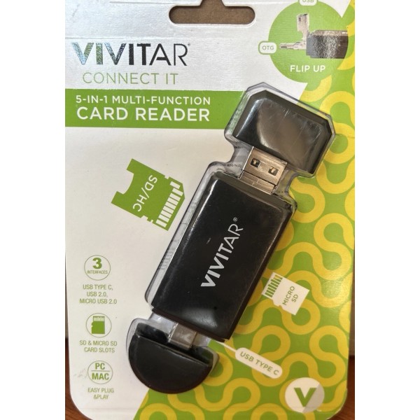 The Vivitar Desktop 5-in-1 USB Card Reader is a versatile accessory designed to support a variety of memory cards including SD and SDHC formats. Its compact design measures 3.55 x 5.48 x 0.55 inches, making it an ideal companion for any desktop or laptop setup. The card reader boasts a sleek black color and is specifically compatible with the Vivitar Connect IT 5 model.