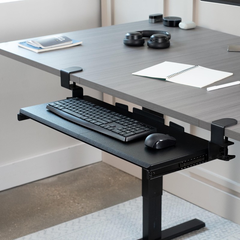 Enjoy the benefits of ergonomic typing angles and a work area that’s spacious and extra sturdy with clamp-on keyboard tray (MOUNT-KB05E) from VIVO! Win back valuable desk space by adding a lower tier surface for the keyboard, mouse, and other small items. Designed with user-geared features such as smooth gliding motion for easy placement, sturdy C-clamps for convenient mounting, and anti-skid padding for scratch resistance, this mount was built to perform! The solid steel track construction makes this mount extra sturdy and guaranteed to last. The under-desk tray placement creates an ergonomic setup that decreases fatigue and muscle strain on the neck, back, and shoulders. The sleek, black appearance adds a classy look to any office while providing ample support for your keyboard and accessories. All hardware is provided for easy installation to get your tray mounted and organized in no time! Please Note: The keyboard tray comes in 2 panels.