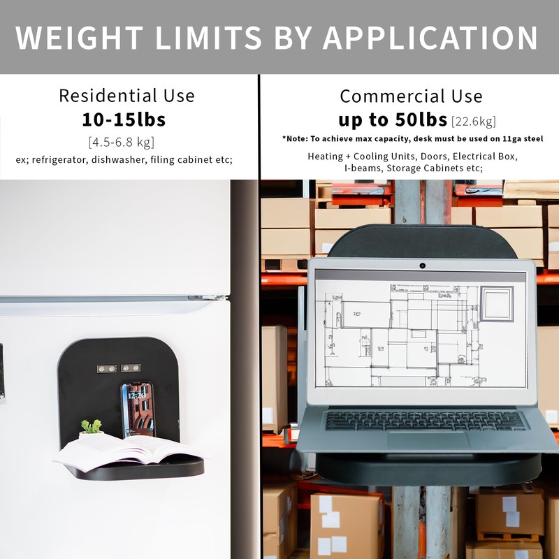 • Portable Magnetic Workstation - Create an instant wall-mounted computer workstation by securing this magnetically mounted tray to any flat steel surface over 1mm thick. The tray supports up to 8 lbs on 1mm steel panels, 15.4 lbs on 2mm steel panels, and 33 lbs on 5mm steel panels.
